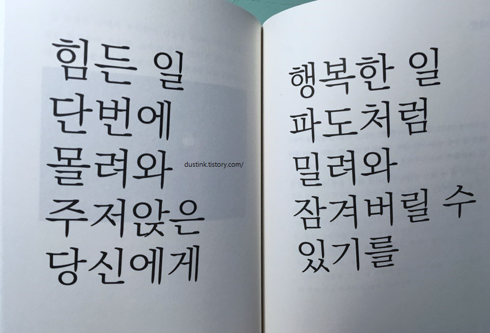 가능하면 천천히 읽고, 시간을 갖고 읽었으면 좋겠다. 빨리 읽어내서 좋을 글귀를 놓칠까봐 아깝다.