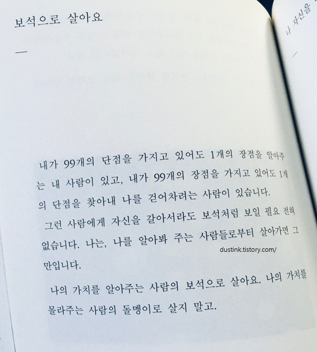 와닿는 글귀도 맘에 담고 싶은 글귀도 정말 많은 책이다. 언젠가 지쳐있는 누군가를 만나게 된다면 꼭 이 책을 선물해야겠다라는 생각을 읽을때 마다 하게 하는 책이다.
