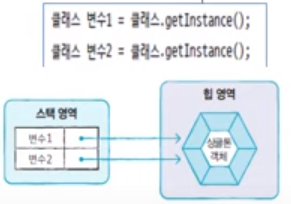 getInstance() 메소드는 단 하나의 객체만 리턴하기 때문에 아래 코드에서 변수1과 변수2는 동일한 객체를 참조한다.