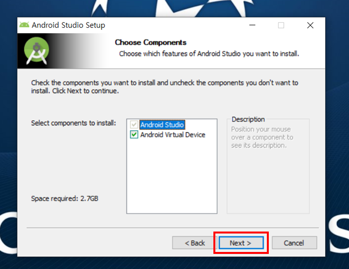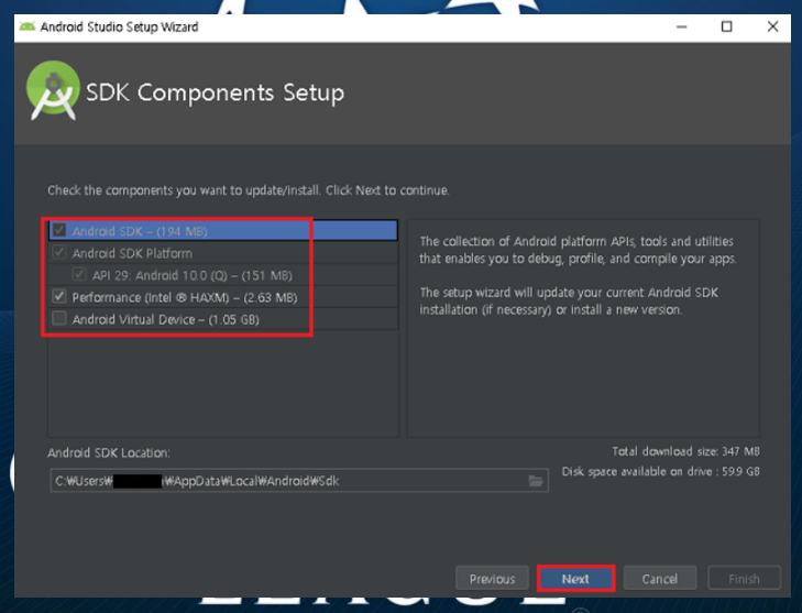 20. SDK 구성 요소 설정. 기본 상태로 두고 Next