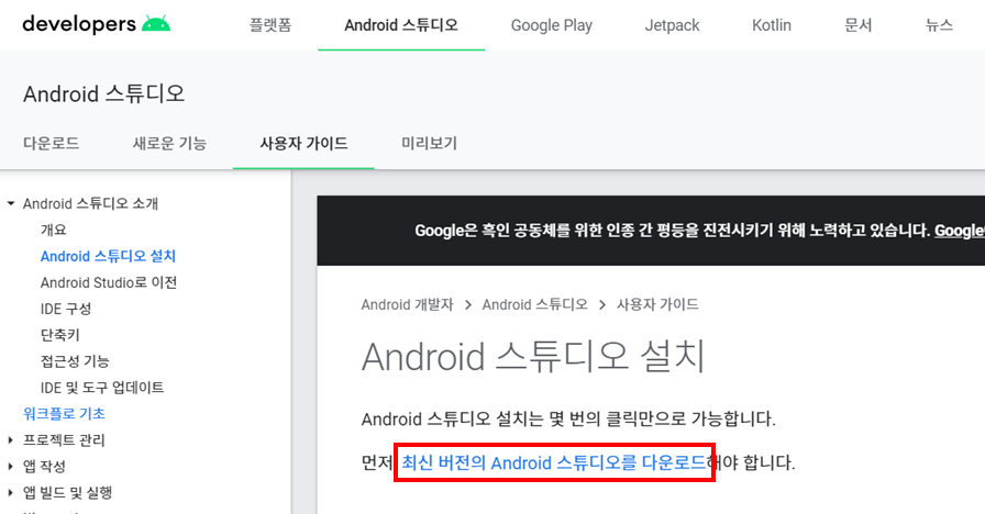 2. '최신 버전의 Android 스튜디오를 다운로드' 클릭