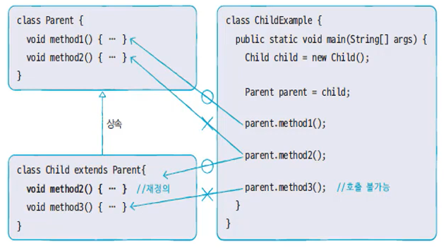 그러나 method2()메소드는 부모, 자식 모두에게 있어, 재정의된 메소드는 타입 변환 이후에도 자식 메소드가 호출 된다.