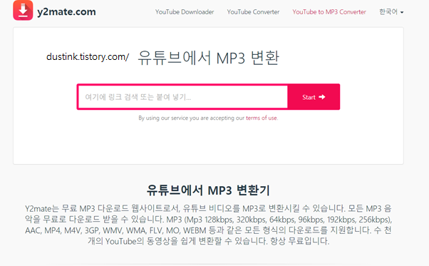 4. 복사한 유트브 URL을 붙여넣기 하고 start 누른다 (url만 입력해도 자동으로 로딩되서 아래 사진처럼 나온다) / 원하는 파일 형식 선택 mp3 or mp4
