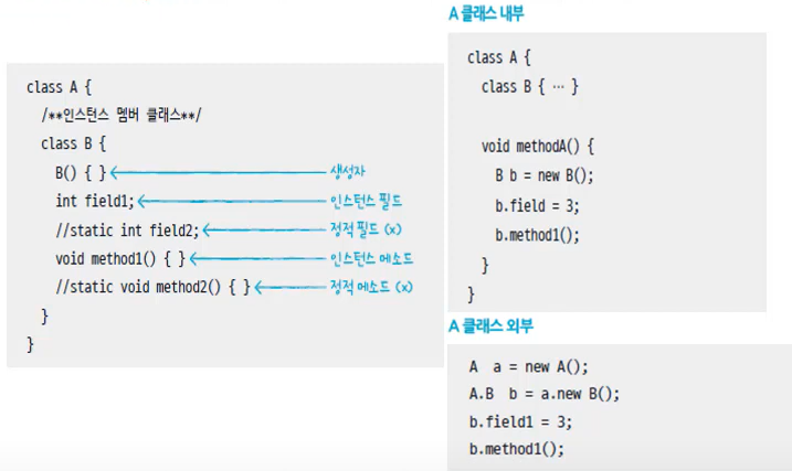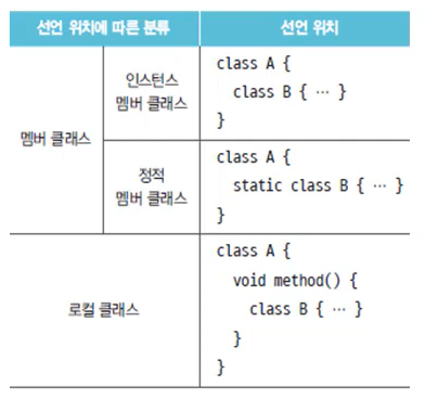 멤버 클래스: 클래스의 멤버로서 선언되는 중첩 클래스를 말한다. 멤버 클래스는 바깥 객체의 필요 여부에 따라 인스턴스 멤버 클래스와 정적 멤버 클래스로 구분된다.