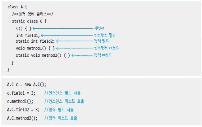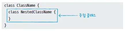 중첩 클래스: 클래스 내부에 선언한 클래스이다. 중첩 클래스를 사용하면 두 클래스의 멤버들을 서로 쉽게 접근할 수 있고, 외부에는 불필요한 관계클래스를 감춤으로써 코드의 복잡성을 줄일 수 있다.