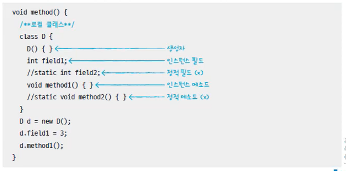 생성자 또는 메소드 내부에서 선언되는 중첩 클래스이며, 새성자 또는 메소드가 실행할 때만 사용한다.