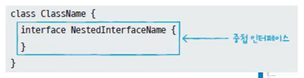 중첩 인터페이스: 클래스의 멤버로 선언된 인터페이스 이다. 중첩 인터페이스는 인스턴스 멤버 인터페이스와 정적 멤버 인터페이스 모두 가능하다. 주로 정적 멤버 인터페이스를 많이 사용하는데 UI프로그래밍에서 이벤트를 처리할 목적으로 많이 활용 된다.