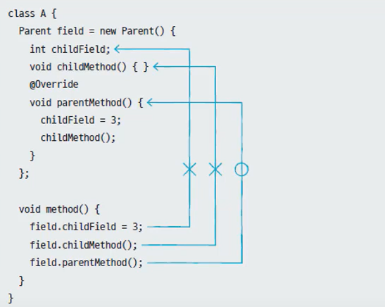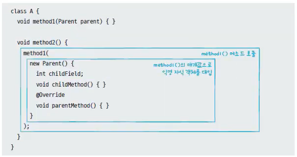 - 메소드 내에서 로컬 변수 선언 시 초기값으로 익명 자식 객체를 생성해서 대입