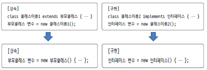 익명 자식 객체: 자식 클래스가 재사용되지 않고 오로지 특정 위치에서 사용할 경우라면 자식 클래스를 명시적으로 선언하지 않고 익명 자식 객체를 생성해서 사용한다.