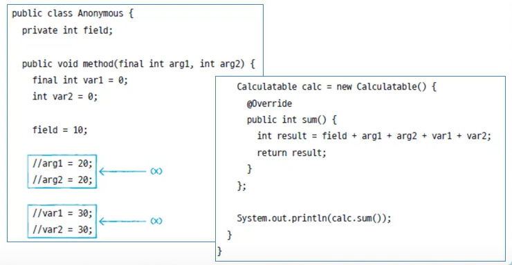 - 컴파일 시 익명 객체에서 사용하는 매개 변수나 로컬 변수는 final특성을 가진다.