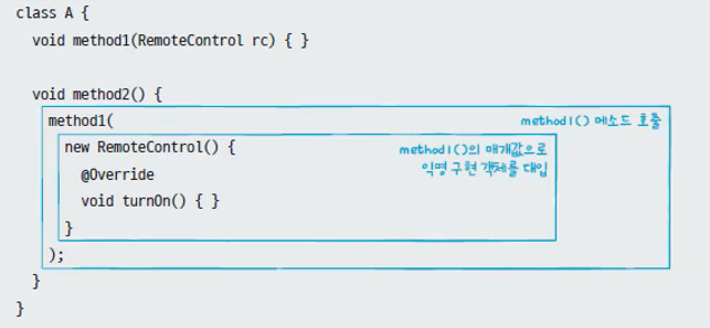 - 매개 변수의 매개값으로 익명 구현객체를 생성하여 대입