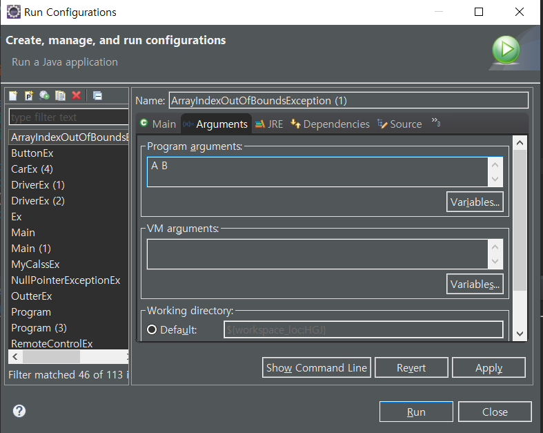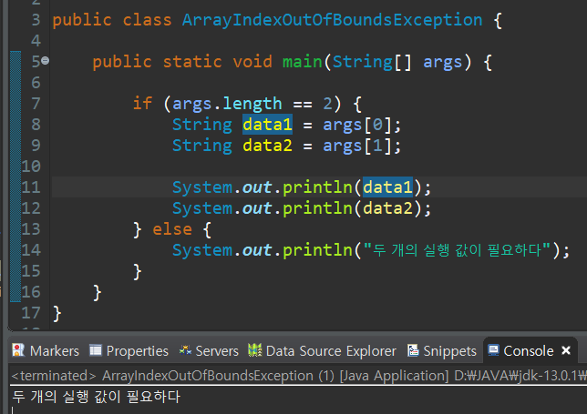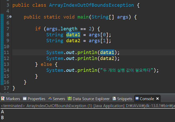 이클립스에서 Run-RunConfigurations 메뉴를 선택한후, Arguments 탭의 Program arguments 입력란에 아래처럼 두개의 매개값을 입력하고 실행하면 예외가 발생하지 않는다.