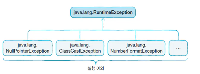 실행 예외: 컴파일러 넌 체크 예외라고도 하며, 실행 시 예측할 수 없이 갑자기 발생하기 때문에 컴파일하는 과정에서 예외 처리 코드가 있는지 검사하지 않는다.