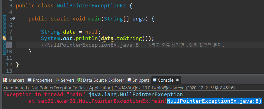 NullPointerException 오류가 난 경우 도트(.) 앞을 확인 하면 된다.