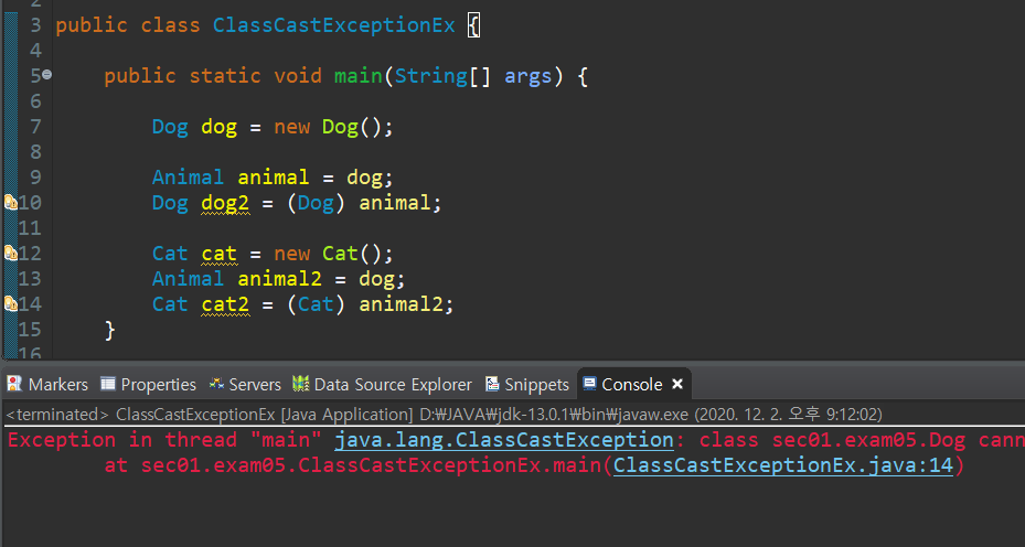 Dog객체를 매개값으로 주어서 Cat 타입으로 변환 할 수 없기때문에 오류가 발생.