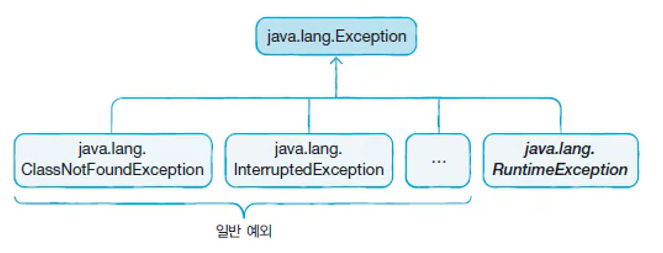 예외 클래스: 자바에서는 예외를 클래스로 관리하며, JVM은 프로그램을 실행하는 도중에 예외가 발생하면 해당 예외 클래스로 객체를 생성하여 예외 처리 코드에서 예외 객체를 이용할 수 있도록 해준다. 모든 예외 클래스는 java.lang.Exception 클래스의 상속을 받는다.