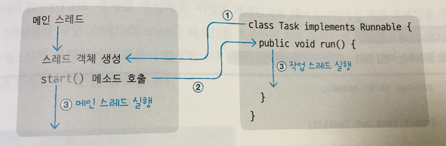 start() 메소드가 호출 되면, 작업 스레드는 매개값으로 받은 Runnable의 run()메소드를 실행하면서 자신의 작업을 처리한다.
