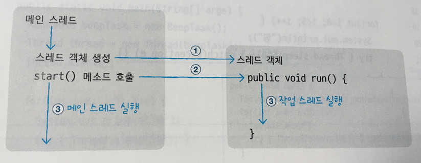 작업 스레드: 메인 작업 이외에 병렬 작업의 수만큼 생성하는 스레드를 말한다. 작업 스레드도 객체로 생성되기 때문에 크래스가 필요하다. Thread 클래스를 직접 객체화해서 생성할 수도 있고, Thread클래스를 상속해서 하위 클래스를 만들어 생성할 수도 있다.
