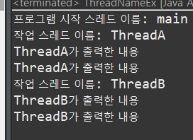 System.out.println(getName() + "가 출력한 내용"); //스레드 이름 얻기