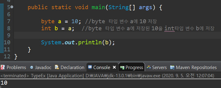 정수 타입 연산자가 결과를 받은 int 타입이라면, 연산이 되는 타입은 int타입보다 작은 byte, short 타입으로 자동 타입 변환되어 수행된다.