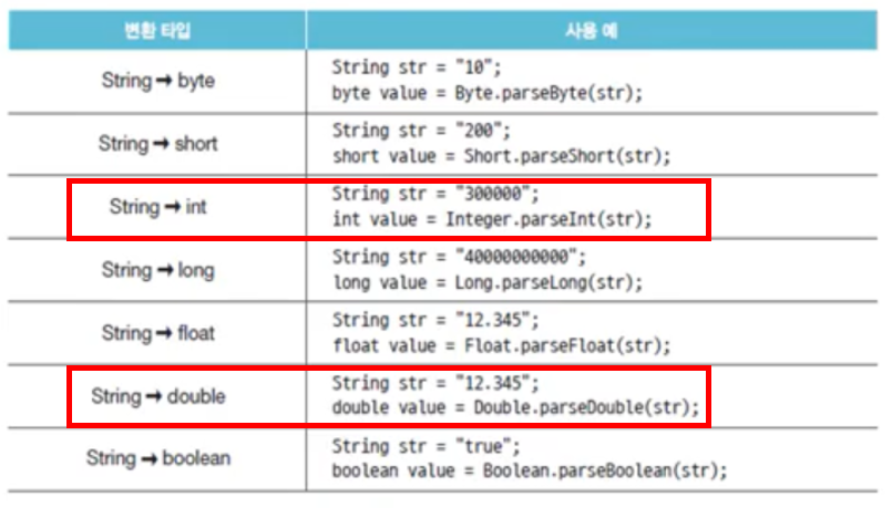 연습 예제를 하다보니 String -> int 변환이 가장 많았다. 실제로 많이 쓰는 것 같다.
