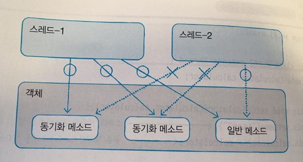 동기화 메소드가 여러 개 있을 경우, 스레드가 이들 중 하나를 실행할 때 다른 스레드는 실행할 수 없다. 하지만 이때 다른 스레드에서 일반 메소드는 실행이 가능하다.