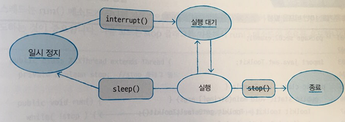 - interrupt(): 일시 정지 상태의 스레드에서 InterruptedException을 발생시켜, 예외 처리 코드(catch)에서 실행 대기 상태로 가거나 종료 상태로 갈 수 있도록 한다.