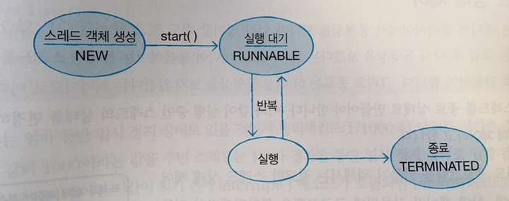 스레드는 실행 대기 상태와 실행 상태를 번갈아 가면서 run()메소드를 조금씩 실행한다. 실행 상태에서 run()메소드가 종료되면, 스레드의 실행은 멈추게 된다. --> 종료 상태