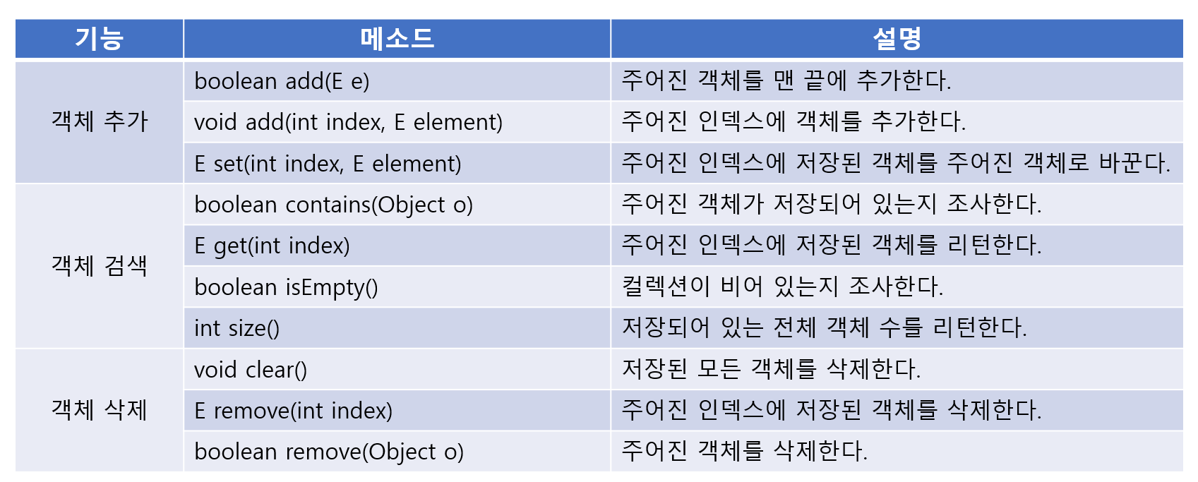 메소드의 매개 변수 타입과 리턴 타입에 E라는 타입 파라미터가 있는데, 이것은 저장되는 객체의 타입을 List컬렉션을 생성할 때 결정하라는 뜻이다.