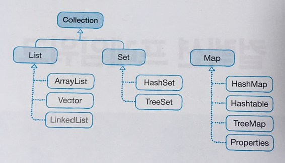 컬렉션 프레임워크의 주요 인터페이스로는 List, Set, Map 세가지가 있다. 아래의 그림은인터페이스로 사용 가능한 컬렉션 클래스(구현 클래스)를 보여준다.