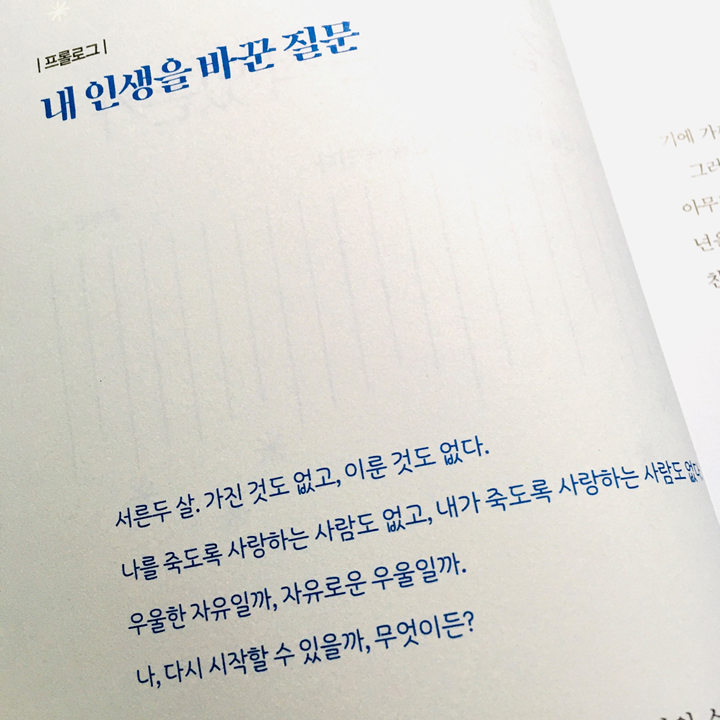 나는 첫 장을 펴고, 뼈를 맞는 기분으로 첫 장을 봤다. 우선 나이때문에도 그랬고, 다시 시작한다는 점에서, 서두를 너무 공감되게 시작하고 있었다. 물론, 내가 이러한 상황이라 그렇게 느껴질 수 있겠지만, 너무 와닿았다.
