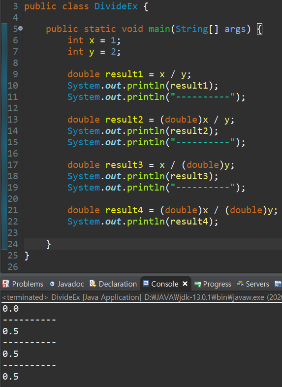 0.5가 나오게 하려면 둘 중 하나 혹은 둘다 double로 타입 변환을 해야한다.