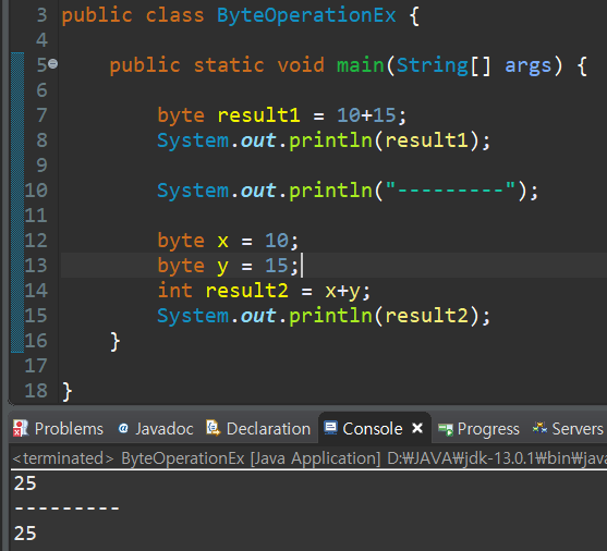 정수 타입 연산자가 결과를 받은 int 타입이라면, 연산이 되는 타입은 int타입보다 작은 byte, short 타입으로 자동 타입 변환되어 수행된다.